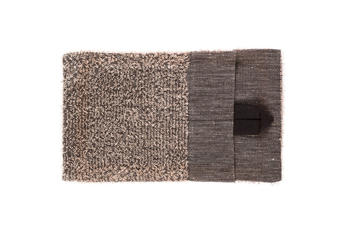 Wash the skin that has softened in the sauna with a wash mitten made of black/beige linen terry cloth. The palm side of the washing mitten is double-stitched.